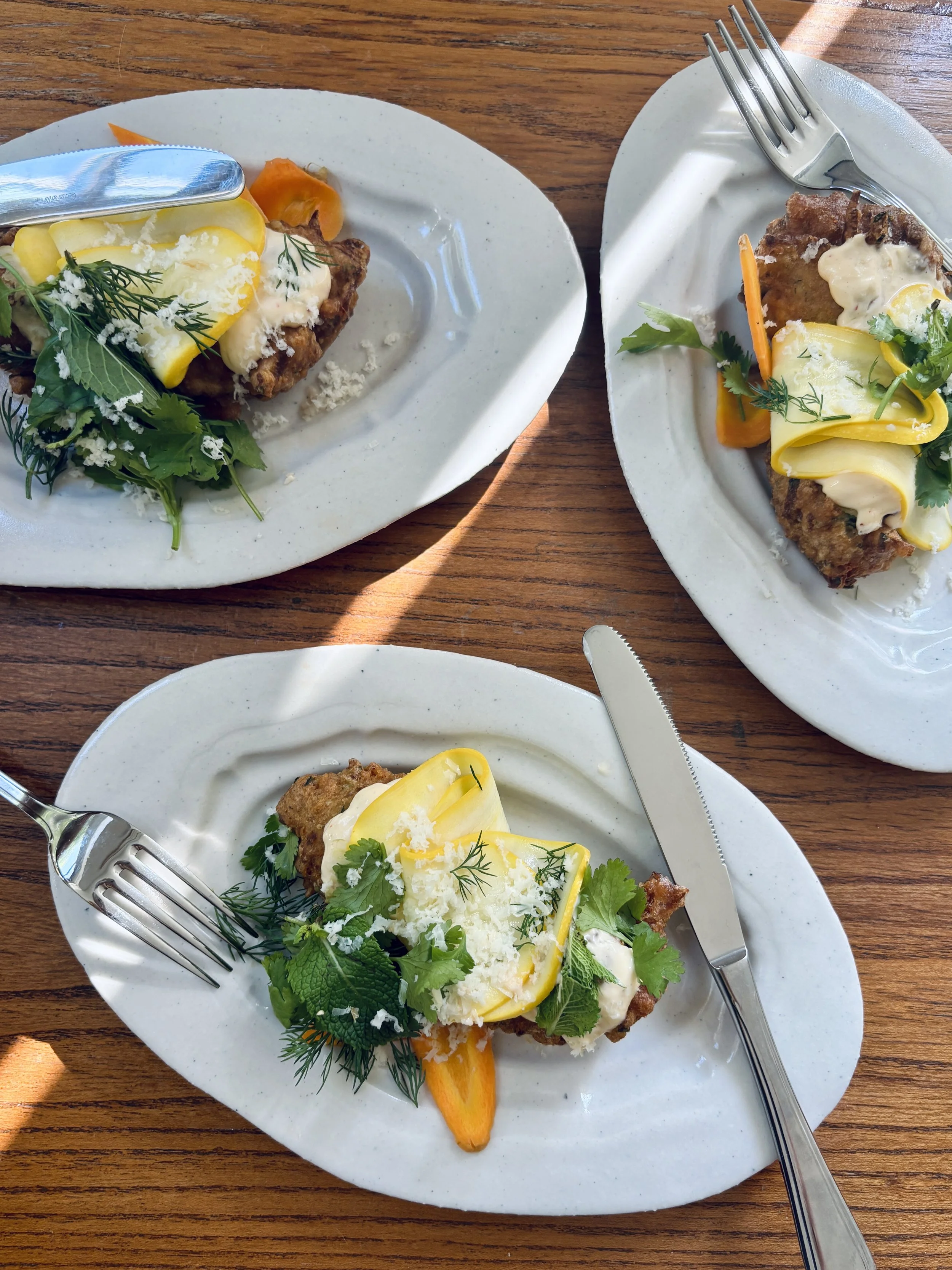 Chez Carrie, au déjeuner, les assiettes sont franches, innovantes mais toujours lisibles : œuf mayo à la diable, pickles, chili-koji et ’nduja ; cioppino de langoustines, fregola sarda et tomates fermentées ; beignets de courgette, scamorza, pickles de saison, aïoli kimchi et herbes fraîches ; ou encore salade aux légumes de fin d’été, sauce Caesar, croûtons focaccia au sourdough, parmesan 36 mois et pangrattato d’anchois.